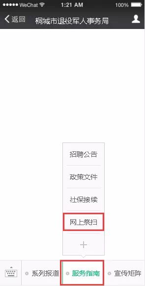 具體步驟如下: 1、點(diǎn)擊桐城市退役軍人事務(wù)局公眾號,“服務(wù)指南”菜單,進(jìn)入“網(wǎng)上祭掃”。 ![]()